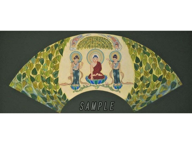 作品名 釈迦三尊像シャカサンソンゾウ原画 額のサイズ 縦47.5㎝×横92.5㎝ 序文と注記 作家「近藤 貴美子」 製作期間 4ヶ月 価 格 ¥286,000税込(額付き・マット仕上げ本体価格¥520,000⇒¥260,000) 日本の法隆寺金剛壁画にある7世紀末頃に描かれた仏教絵画は歴史的資料が少なく作者は見つかってませんが、アジアの古代仏教の代表する作品の一つである釈迦三尊像は釈迦如来を中尊とし左右に脇侍として薬王菩薩・薬上菩薩が配されています。 この作品は扇面図センメンズとして扇上に広がる形で仕上げています。 又、釈迦如来の頭上には菩提樹の樹が配されておりその横には飛天も飛んでおり非常に吉祥な仏画です。 【作家】 近藤 貴美子(Kimiko Kondo) 大阪府出身 京都嵯峨美術短期大学日本画卒業、西陣織デザイン、中学校美術教師を経て、仏画修復の伝承を学び独自の画風を確立。 現在吹田にて仏画教室を主宰。オンライン講座も開催しています。詳細は下記HPよりご確認ください。 【作家先生からのメッセージ】 密教で仏画は発展しました。日本画の絵の具のまったりとした美しさ、静の美しさ、そして細密な美しさを古来の手法で描いております。 1000年も、又、それ以上も祈れるよう、朽ちないそして自然な物から作り出した(紙、にかわ、絵の具など)優しさを皆様にお届けできるよう日々精進しております。 仏画の中には一例として、京都の中でも世界遺産にも登録されている宇治の平等院の「鳳凰堂」の柱・壁面・長押・貫・天井、に描かれている極彩色の菩薩や絵巻模様を一つずつ取り出して、復元して描いた菩薩(ぼさつ)や暈繝(うんげん)紋様をモチーフにたくさん使っております。 暈繝(うんげん)の美しい紋様や天然の岩絵の具、水干(すいひ)絵の具で描かれる仏画の配色の美しさもぜひ堪能してみて下さい!! 【ホームページ】 https://kimiko-kondou.jimdo.com