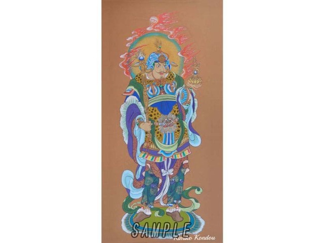 作品名 毘沙門天像ビシャモンテンゾウ原画 額のサイズ 縦76.5㎝×横41.5㎝ 序文と注記 作家「近藤 貴美子」 製作期間 7ヶ月 価 格 ¥473,000税込(額付き・マット仕上げ本体価格¥860,000⇒¥430,000) 約1500年前聖徳太子が毘沙門天に先勝祈願し信仰していた事が始まりとされています。 四天王の一つで仏教を守護する護法善神の一柱の多聞天とされています。 須弥山(シュミセン)中腹で北方を守る七福神の一尊であり甲冑カッチュウを付けて宝塔を持つ姿は上杉謙信等の武将が進行した戦いの神様のイメージがあると思いますが、商売繁盛・金運・財運・勝運・武運長久・開運長久・厄除開運などのご利益があるとされています。 力強さと七福神の福徳を授かるよう願いながら彩色と筆のタッチで仕上げています。 【作家】 近藤 貴美子(Kimiko Kondo) 大阪府出身 京都嵯峨美術短期大学日本画卒業、西陣織デザイン、中学校美術教師を経て、仏画修復の伝承を学び独自の画風を確立。 現在吹田にて仏画教室を主宰。オンライン講座も開催しています。詳細は下記HPよりご確認ください。 【作家先生からのメッセージ】 密教で仏画は発展しました。日本画の絵の具のまったりとした美しさ、静の美しさ、そして細密な美しさを古来の手法で描いております。 1000年も、又、それ以上も祈れるよう、朽ちないそして自然な物から作り出した(紙、にかわ、絵の具など)優しさを皆様にお届けできるよう日々精進しております。 仏画の中には一例として、京都の中でも世界遺産にも登録されている宇治の平等院の「鳳凰堂」の柱・壁面・長押・貫・天井、に描かれている極彩色の菩薩や絵巻模様を一つずつ取り出して、復元して描いた菩薩(ぼさつ)や暈繝(うんげん)紋様をモチーフにたくさん使っております。 暈繝(うんげん)の美しい紋様や天然の岩絵の具、水干(すいひ)絵の具で描かれる仏画の配色の美しさもぜひ堪能してみて下さい!! 【ホームページ】 https://kimiko-kondou.jimdo.com