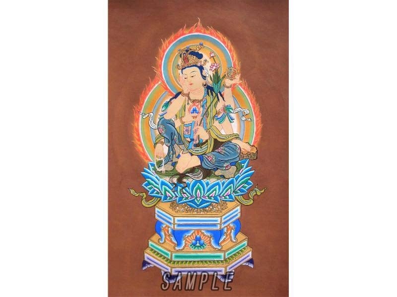 六本の手の中に如意宝珠と法輪を持ち、智慧、財福、福徳授与、安産、延命、と言ったご利益があり、いつもどうしたら人々を救えるかを考えているお姿を復元彩色して描きました。